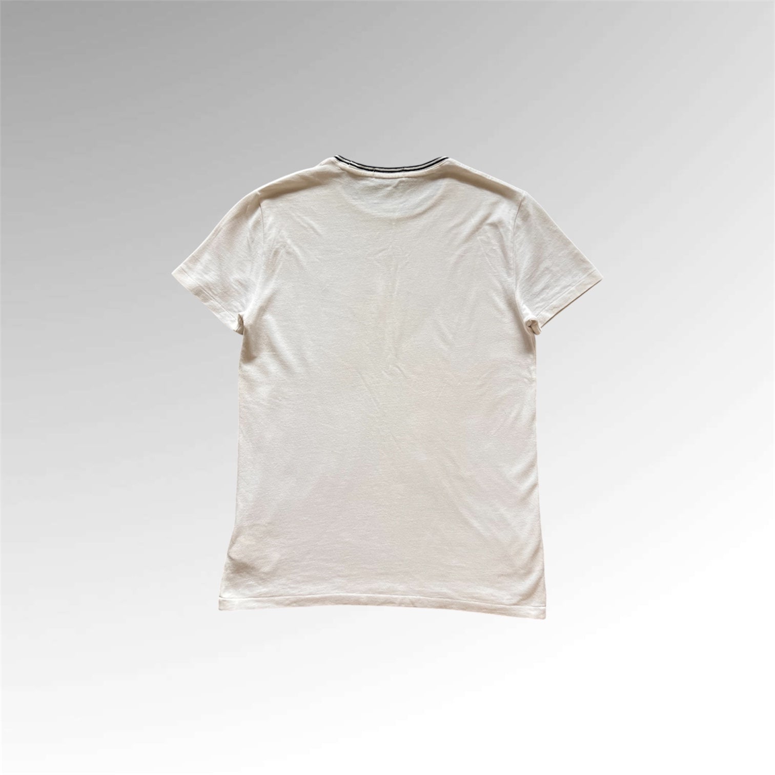 What sets this T-shirt apart is its distinctive neckline, featuring a blue and white striped collar that adds a touch of nautical charm. The inclusion of the "POLO" text within the striped design is a clever nod to the brand's heritage, subtly reinforcing its identity without overwhelming the overall aesthetic. This thoughtful detail elevates the T-shirt beyond a simple wardrobe staple, transforming it into a statement piece that speaks to a refined sense of style. The contrasting colors of the collar against the white fabric create a visually appealing contrast, drawing the eye and adding a dynamic element to the design.